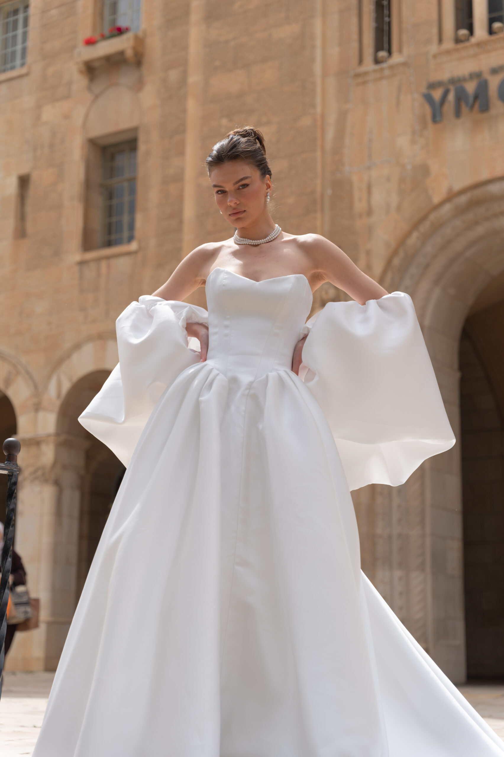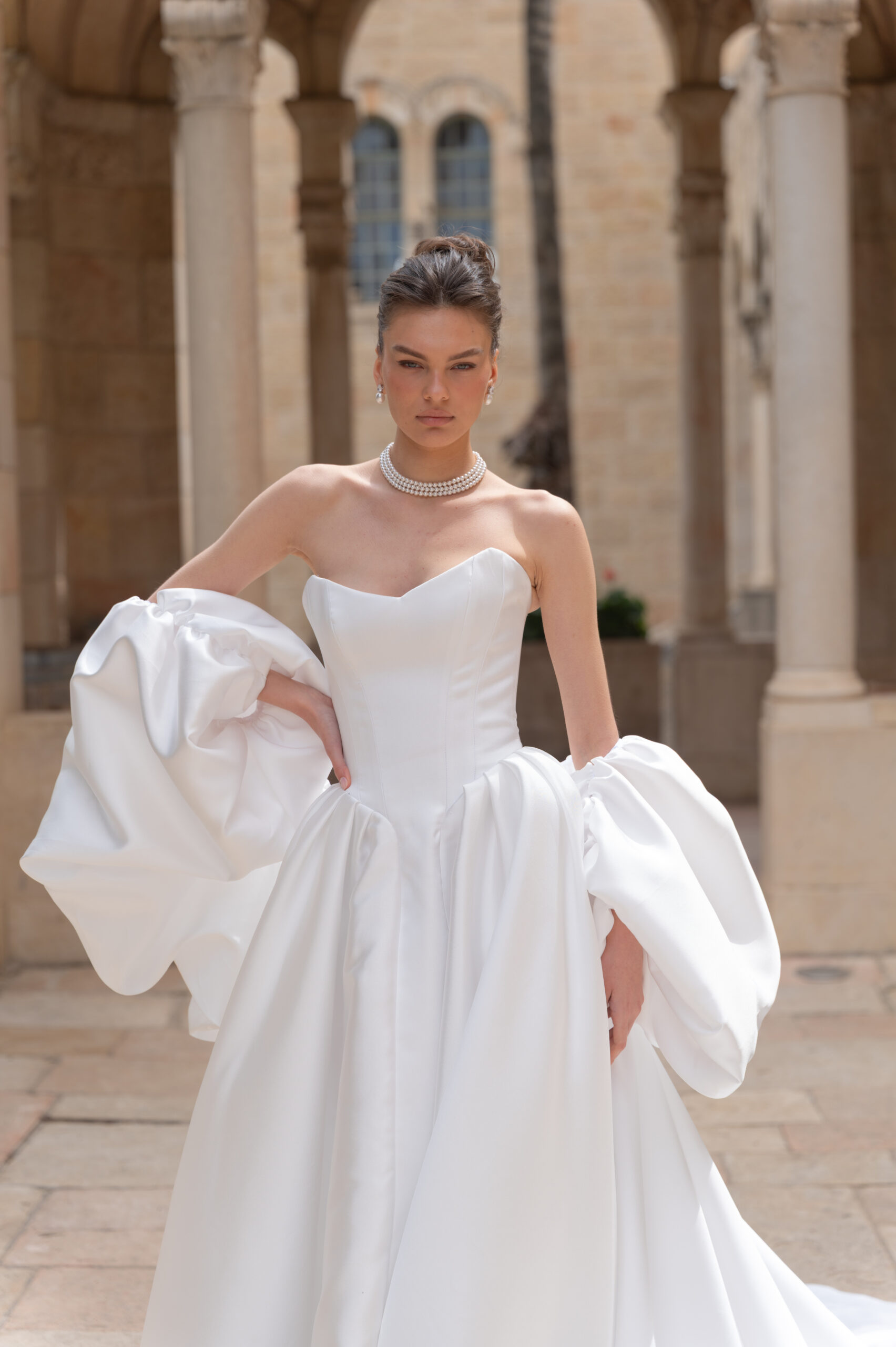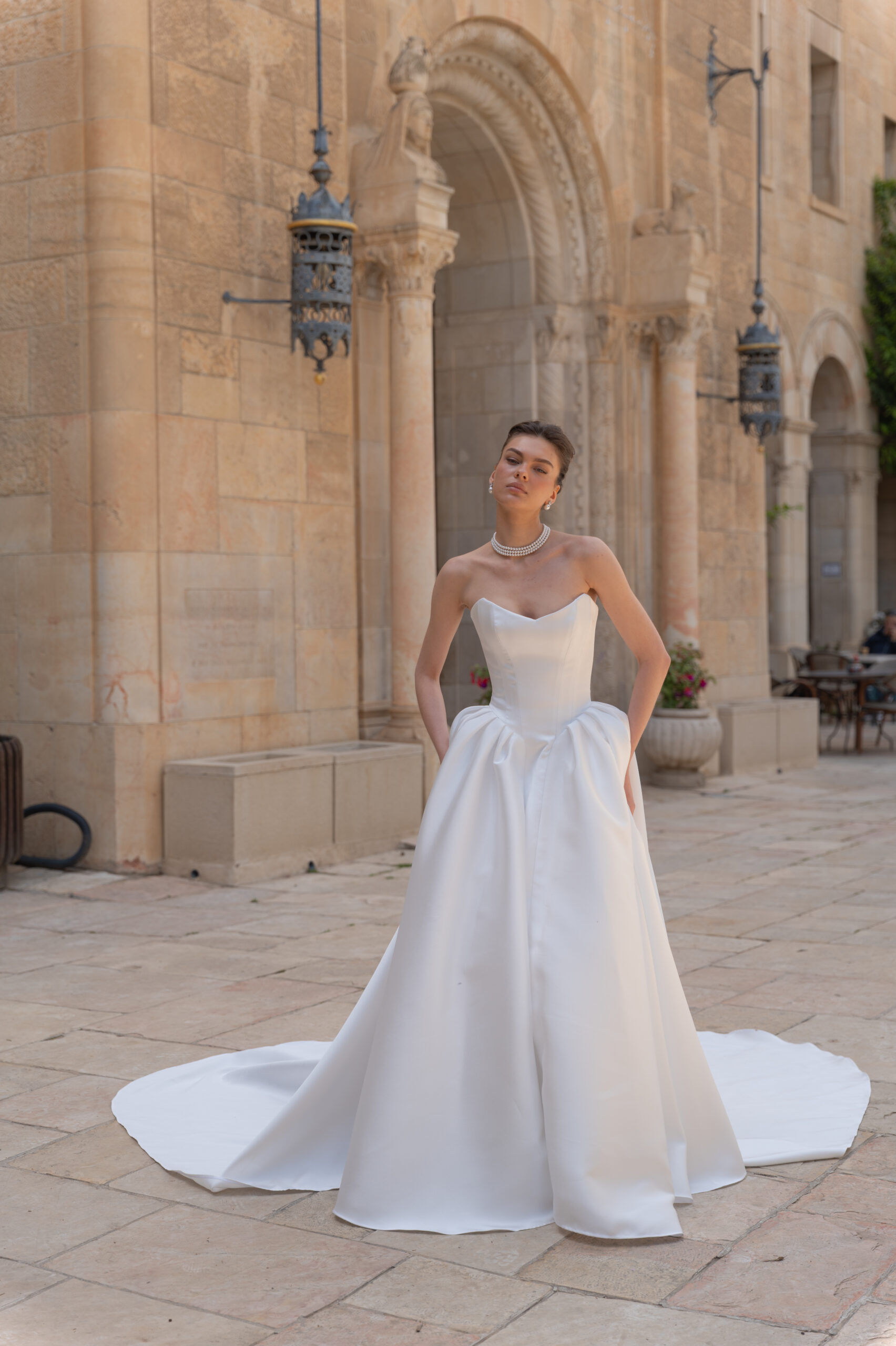 שמלת כלה קלאסית ויוקרתית עשויה מבד בעל ברק עדין, המשלבת מחוך חלק בגזרת סטרפלס חתולי ובעל מראה אצילי, עם חצאית נפוחה ומלאת נוכחות המעניקה מראה נסיכותי וקלאסי. ניתן להוסיף את השאל הנפוח והיוקרתי למראה יותר דרמטי.