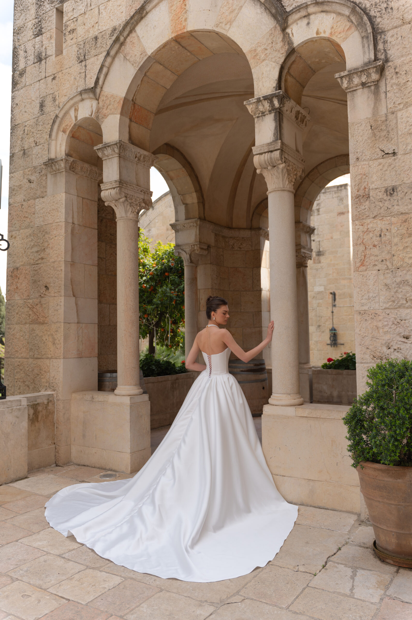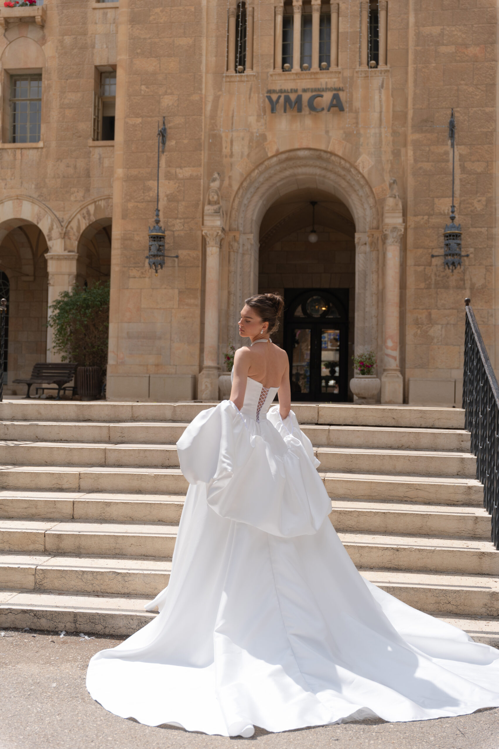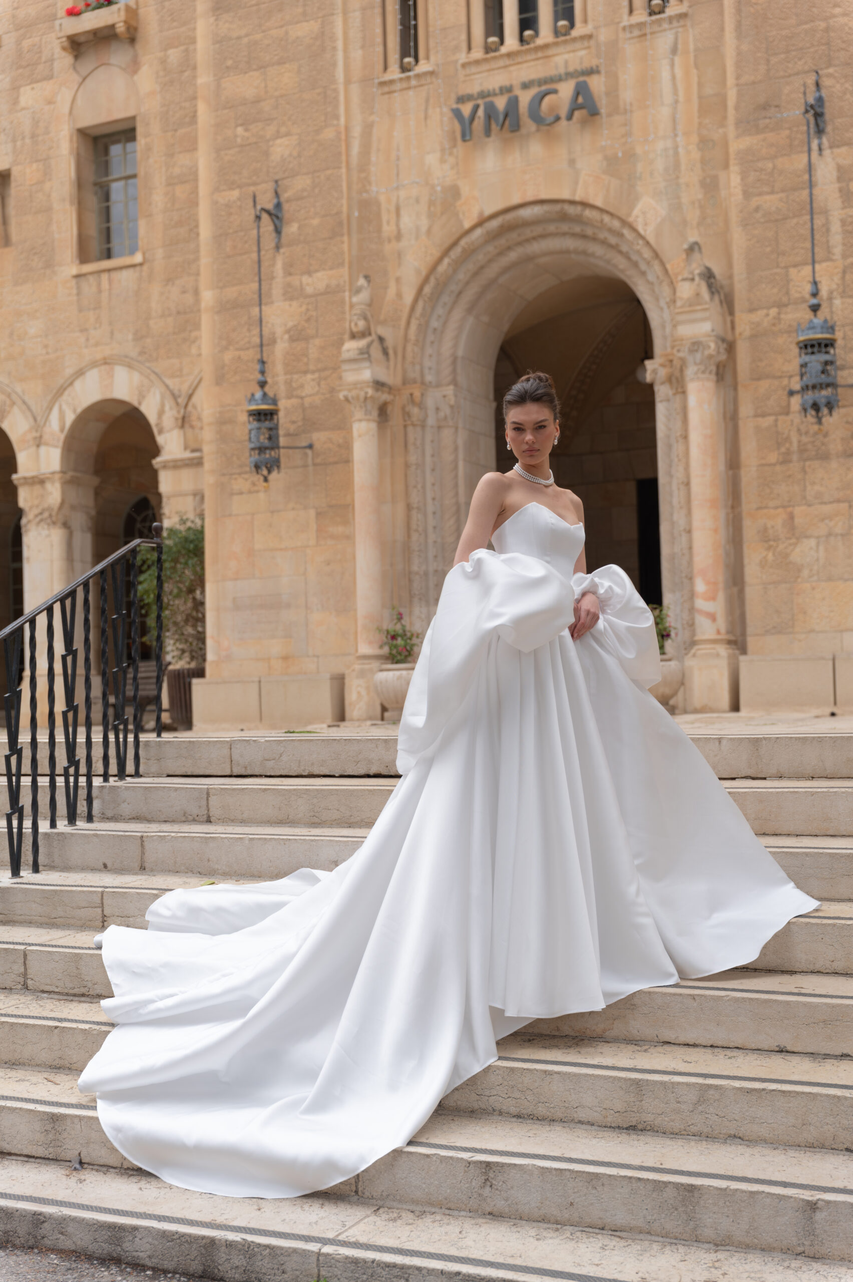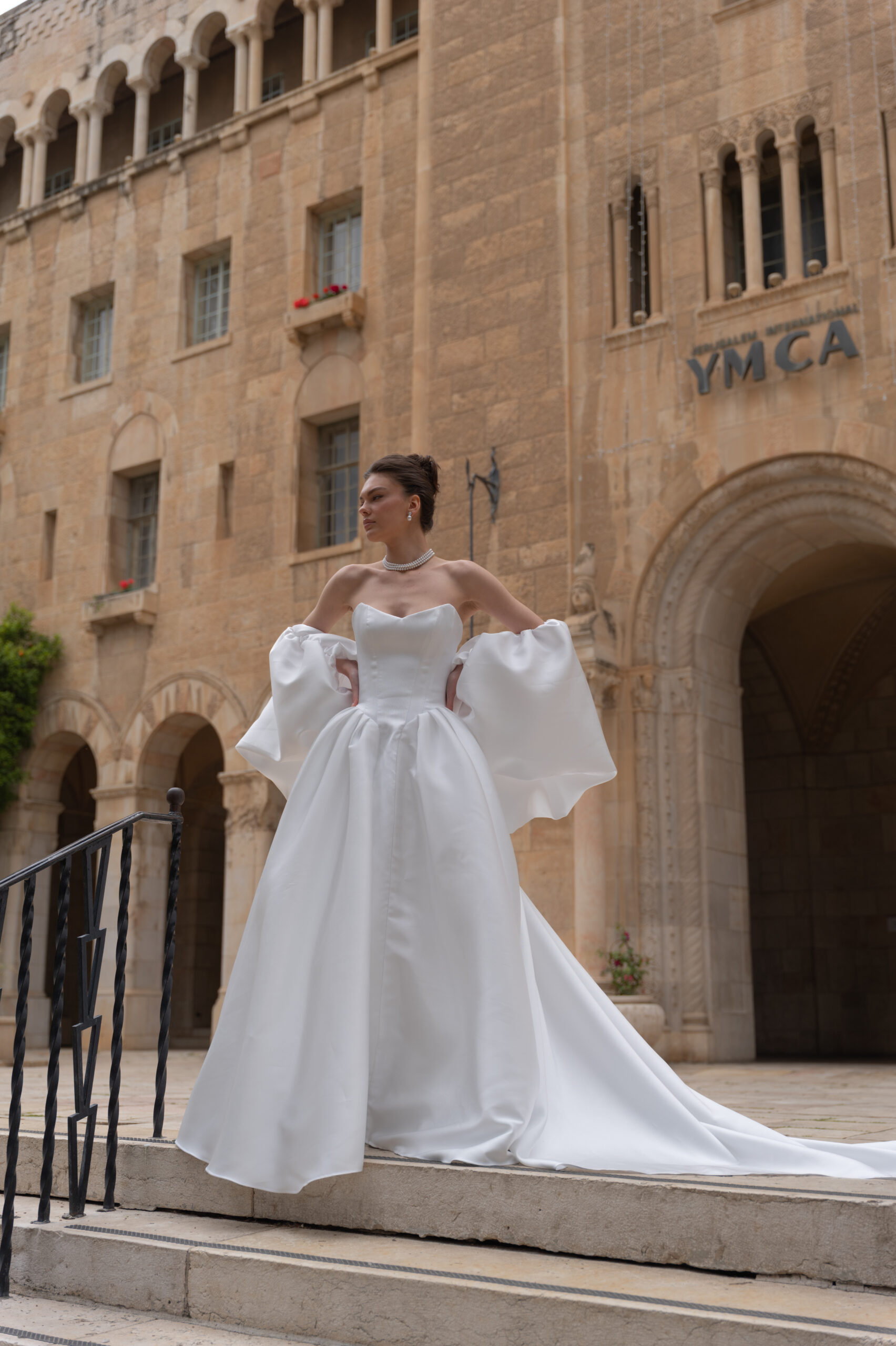 שמלת כלה קלאסית ויוקרתית עשויה מבד בעל ברק עדין, המשלבת מחוך חלק בגזרת סטרפלס חתולי ובעל מראה אצילי, עם חצאית נפוחה ומלאת נוכחות המעניקה מראה נסיכותי וקלאסי. ניתן להוסיף את השאל הנפוח והיוקרתי למראה יותר דרמטי.