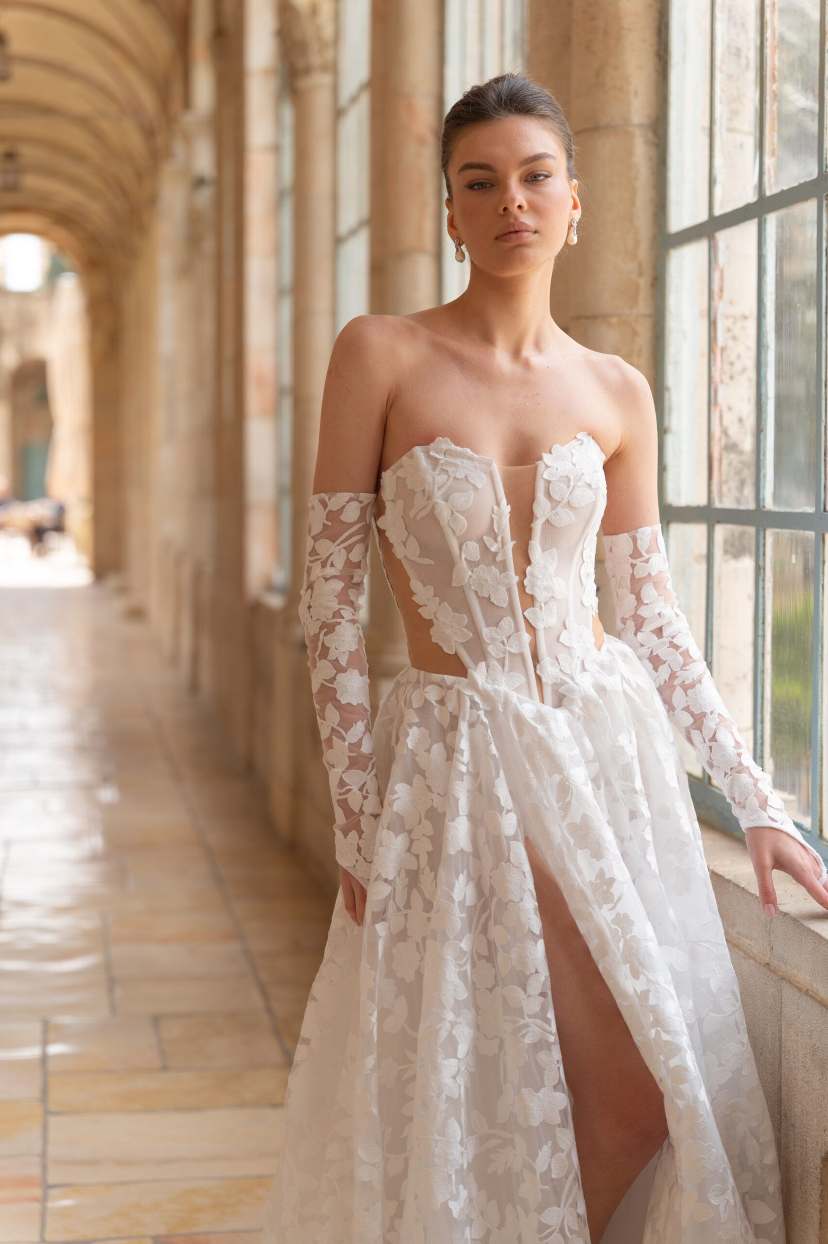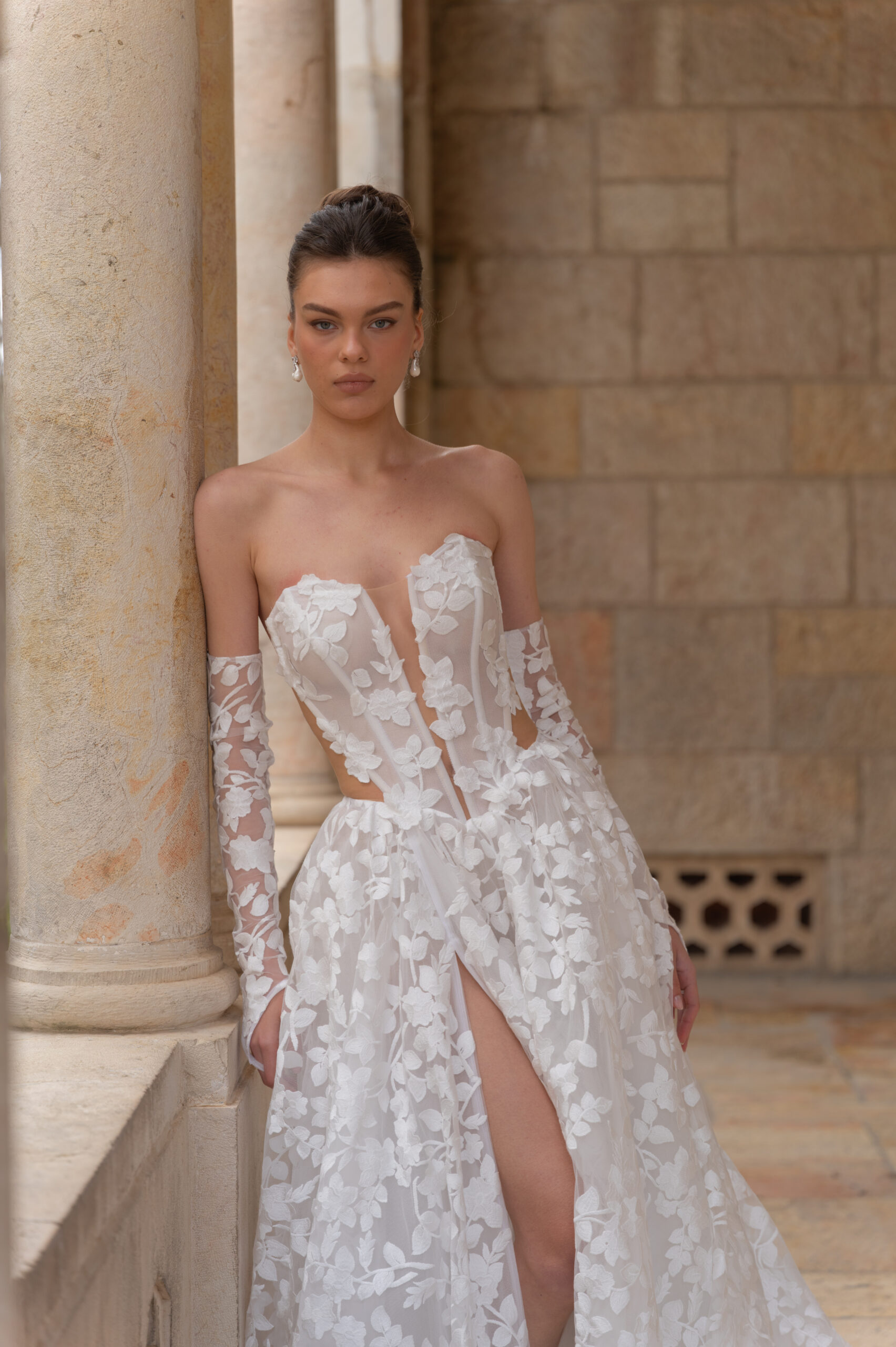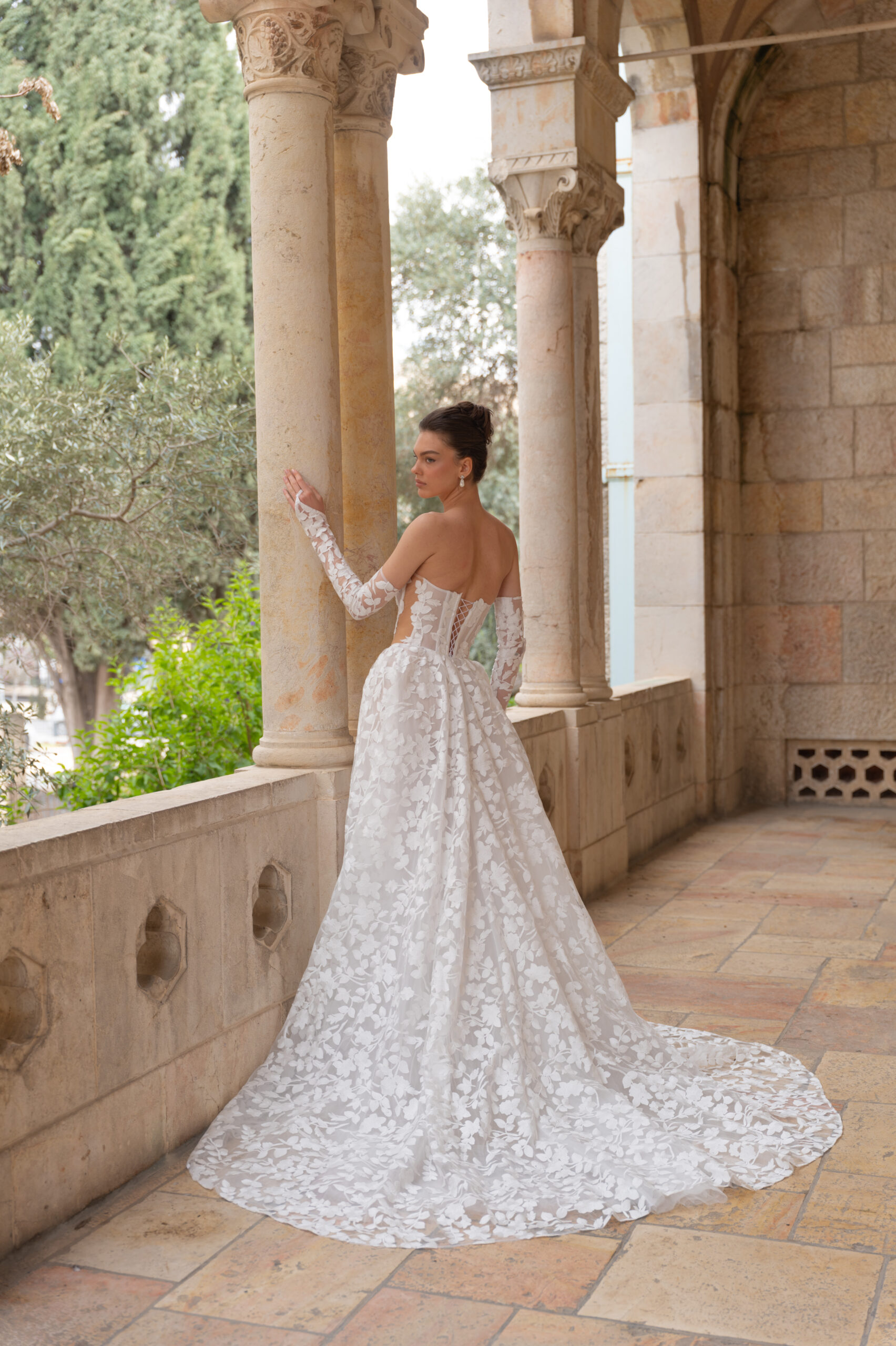 עשויה בד רקמת פרחים עשיר עם משחקי שקיפות בצידי הגוף ובמחשוף. השמלה מתאפיינת בשסע עמוק, שובל ארוך ומרשים וכפפות תואמות למראה אצילי ובלתי נשכח.