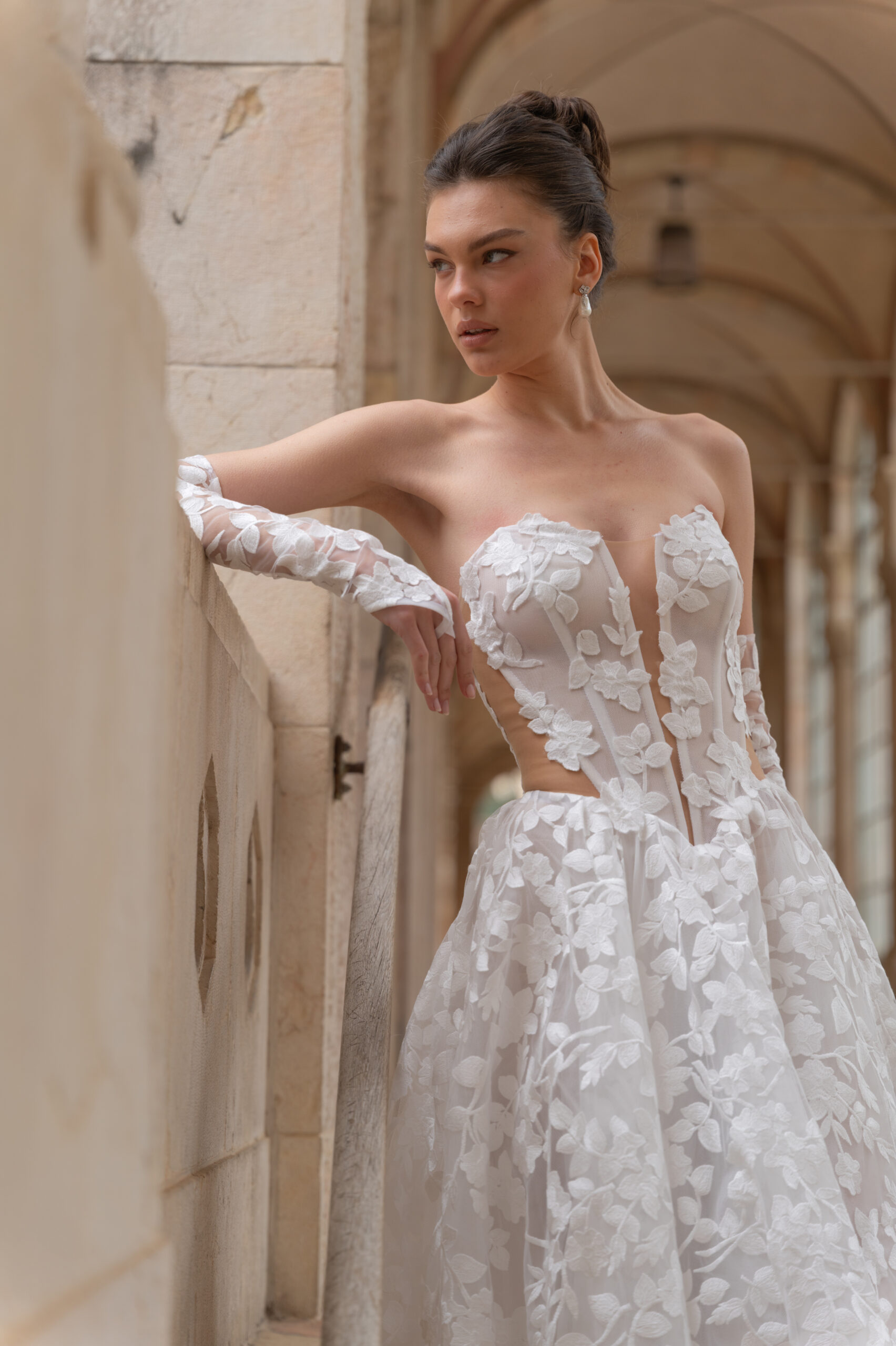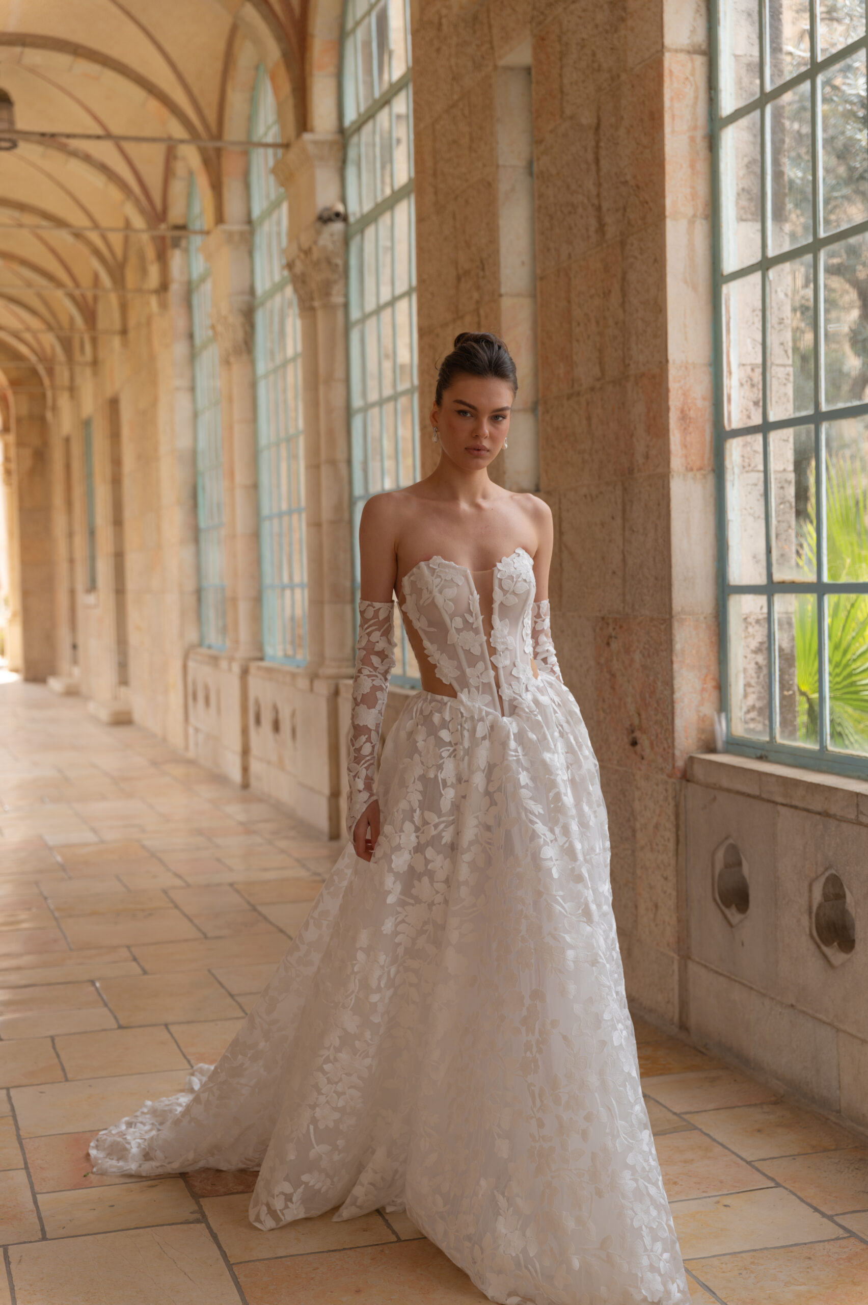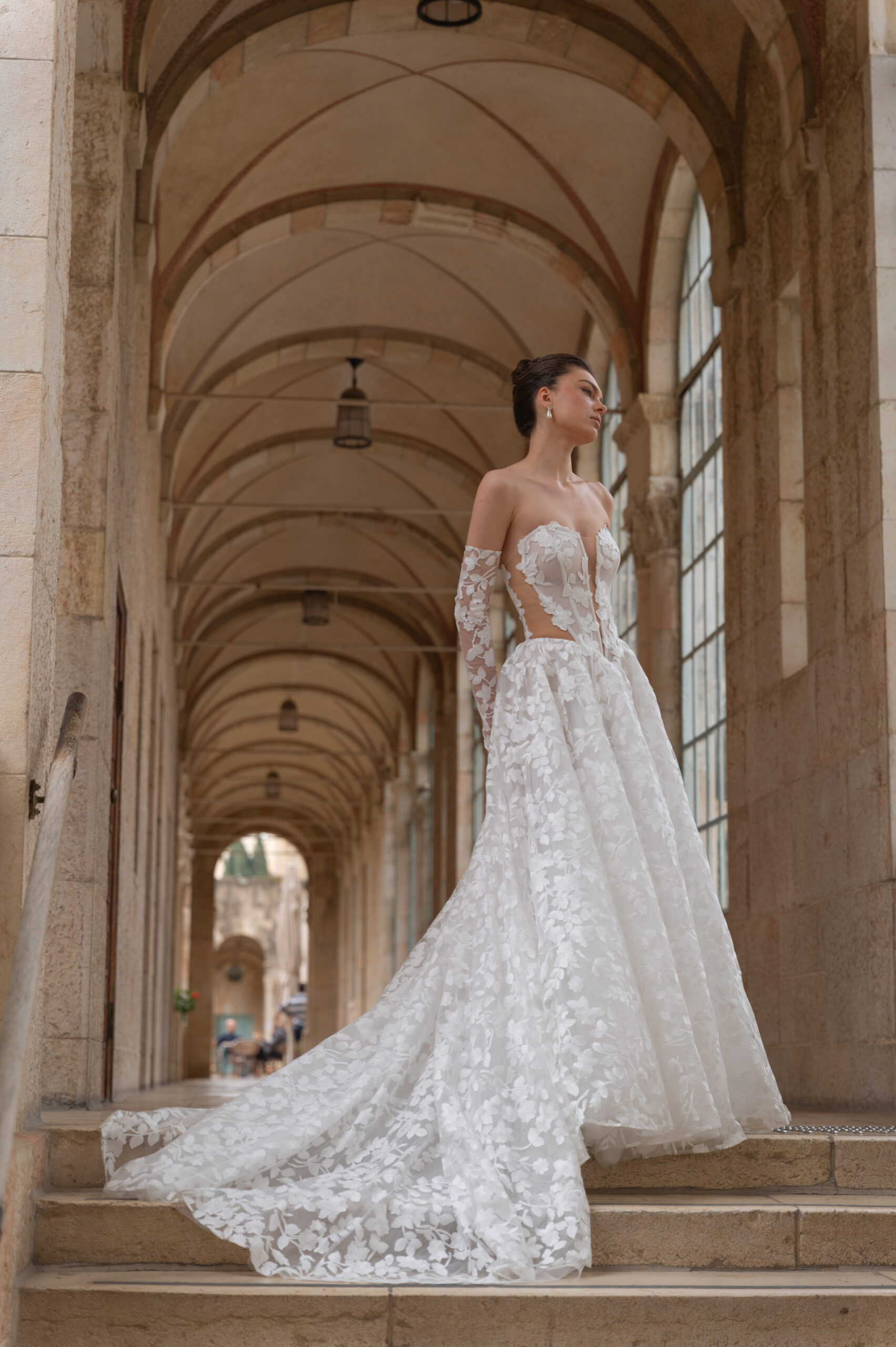 עשויה בד רקמת פרחים עשיר עם משחקי שקיפות בצידי הגוף ובמחשוף. השמלה מתאפיינת בשסע עמוק, שובל ארוך ומרשים וכפפות תואמות למראה אצילי ובלתי נשכח.